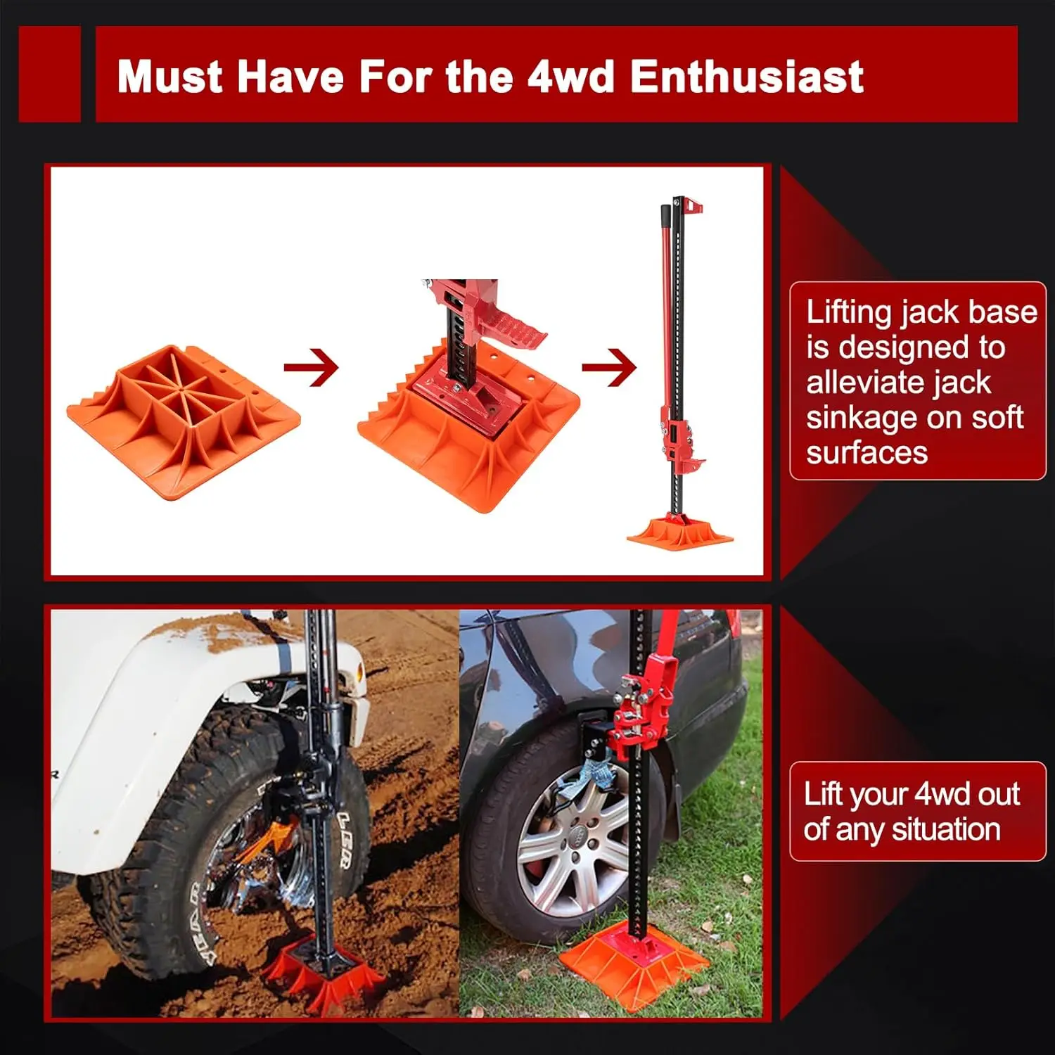 This heavy-duty high lift farm jack is designed for reliable offroad recovery and versatile lifting tasks. Key features include: 1. **Robust Construction**: Built with all-cast iron components and solid steel construction, ensuring maximum strength and durability to maintain shape under heavy loads. 2. **Premium Materials**: Features a powder-coated finish with zinc-plated hardware for superior rust resistance, along with a rugged ABS base plate that provides stability on various surfaces. 3. **Adjustable Design**: Equipped with a quick-release spring-loaded pin for easy height adjustment, offering a maximum lifting height of 42 inches and a capacity of 3 tons (7000 lbs). A shear bolt safety mechanism prevents overload use. 4. **Versatile Applications**: Ideal for offroad travel, allowing you to lift, push, or pull vehicles like trucks, Jeeps, ATVs, SUVs, and UTVs out of mud, sand, or snow. Also suitable for farm use such as fence work or stump removal. 5. **Professional Base Plate**: The included base plate minimizes sinkage on soft terrain with serrated teeth for scraping hard surfaces and a center hole for convenient storage on the jack bar. This jack is engineered to handle challenging recovery situations while providing long-lasting performance in demanding environments.