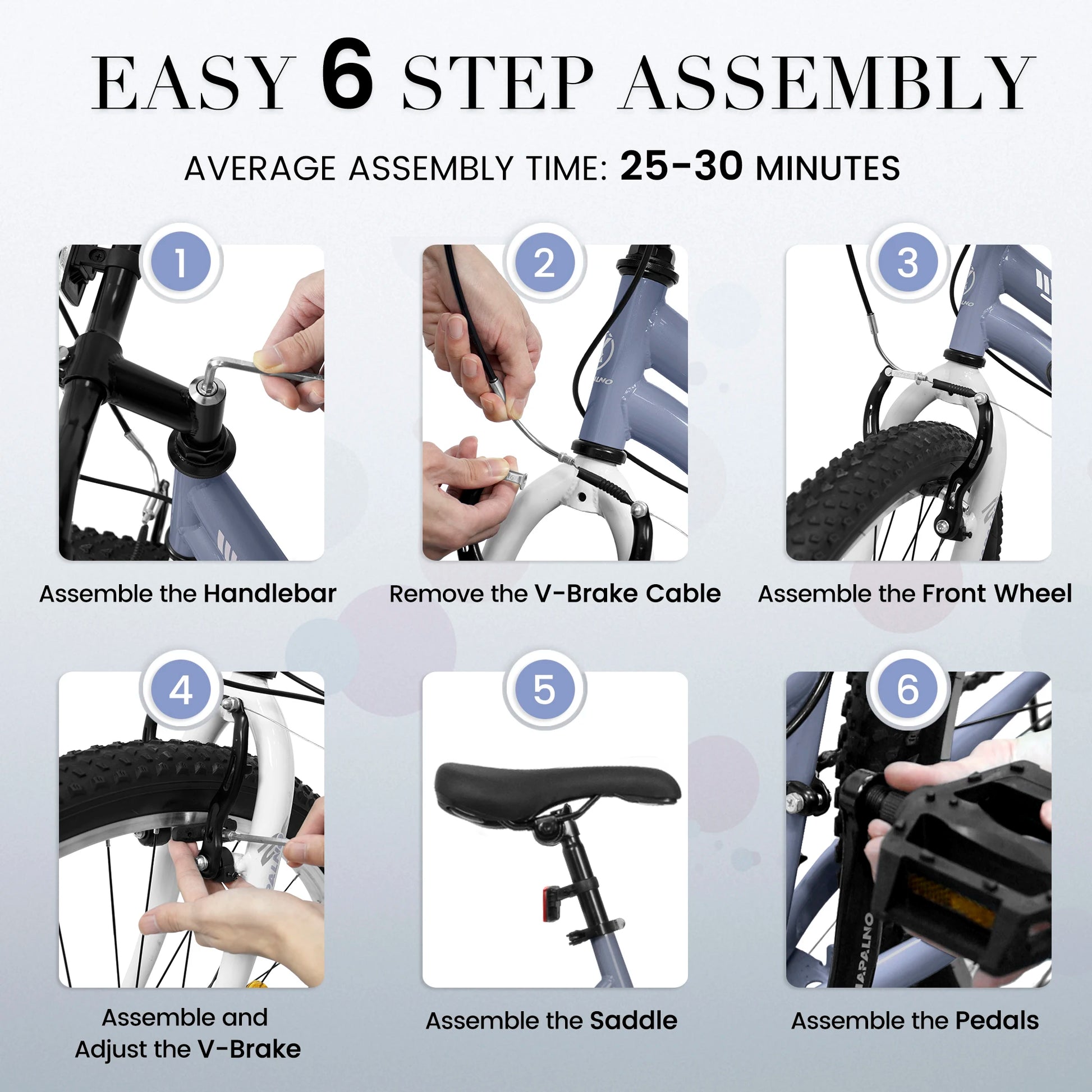 【85% Pre-Assembled】85% of the bike is already assembled. You will need to install the pedals, handlebars, saddle, front wheel, and inflate the tires. These will take about 20 minutes. We will provide bicycle manual and assembly video. If the manual is lost, please contact us for an electronic manual.