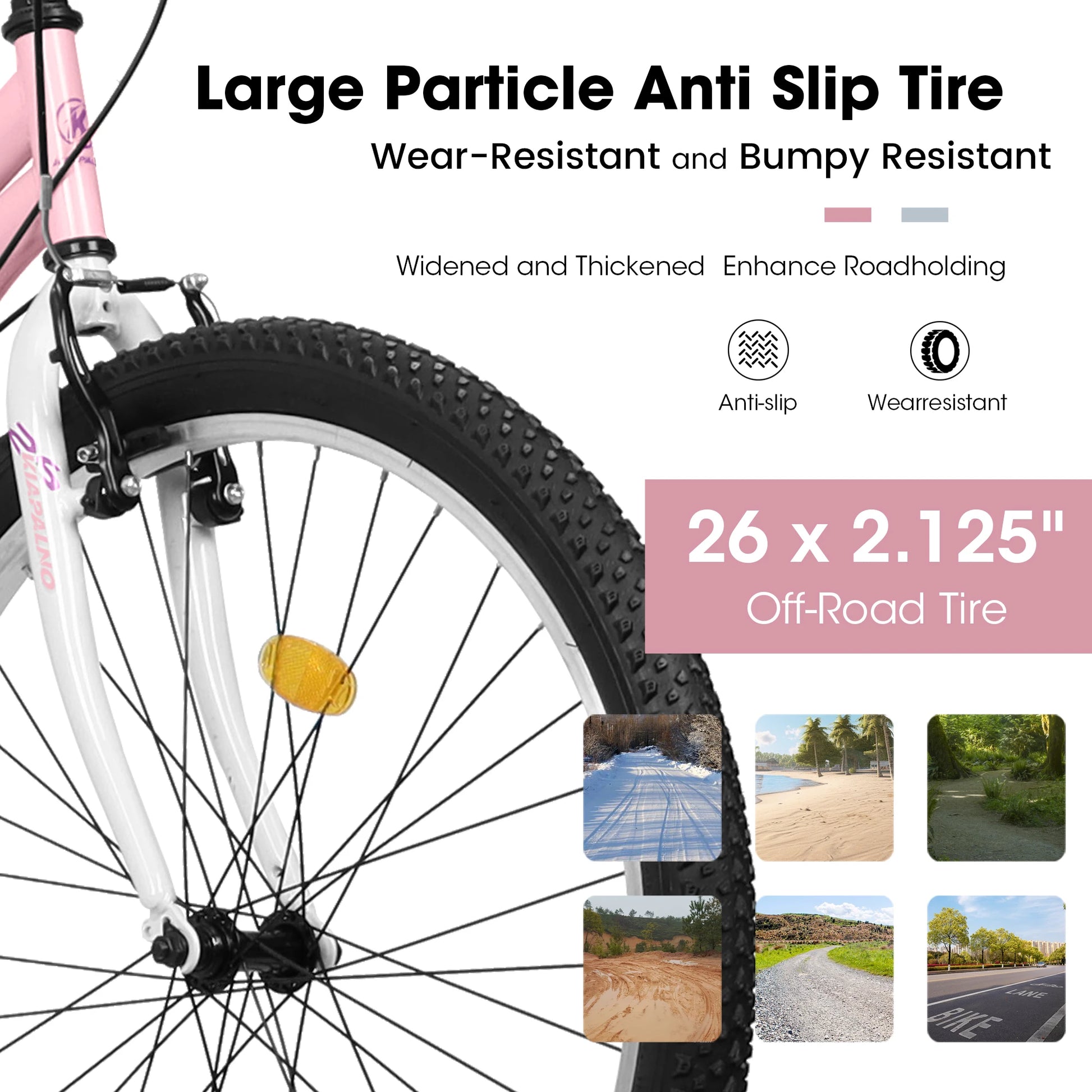 【26*2.125" All-Terrain Tires】Made of high quality rubber, all-terrain tires with strong puncture ressistance soften the bumps and stick to the Dirt, Trail, Gravel, Paved Path for a smooth, stable ride: strong grip, have a super excellent anti-skid function and is not easy to slip.