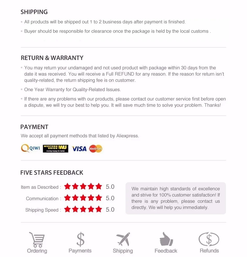 After you recived the goods, pls give us a positive feedback if you are satisfied with our quality. If any do not satisfy or angry, Please contact us immediately before leaving feedback, We will try our best to solve the problem until you satisfy.