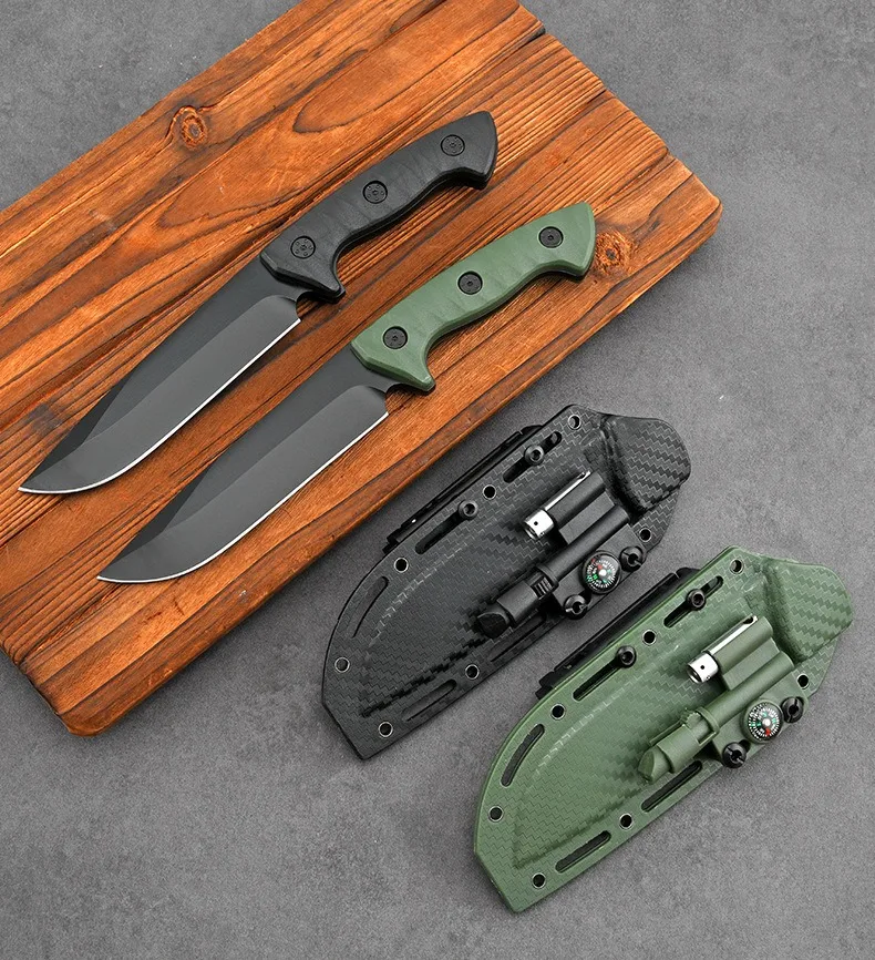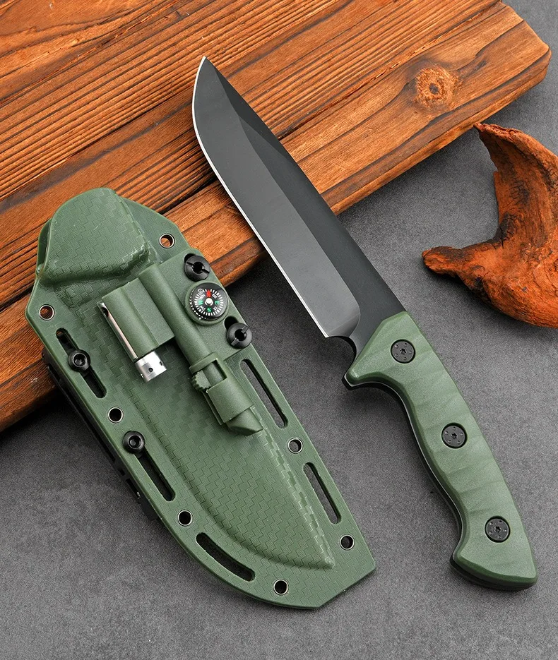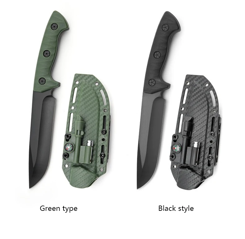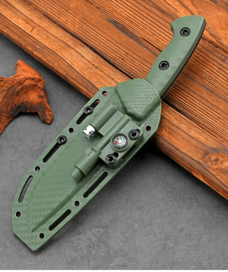 Outdoor straight knife, tactical K-sheath knife, camping survival knife with whistle, magnesium rod, compass, flashlight