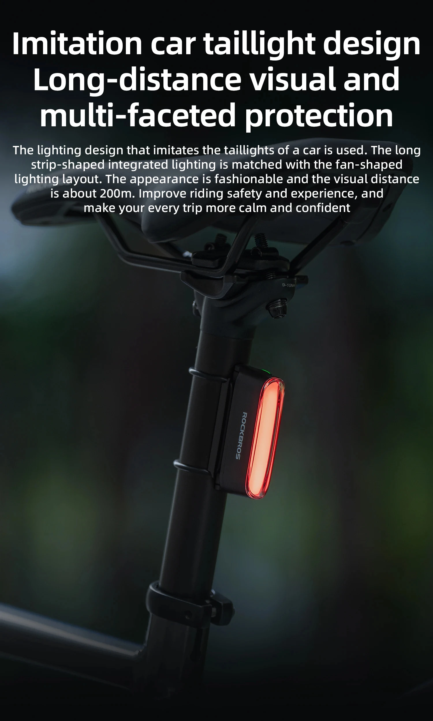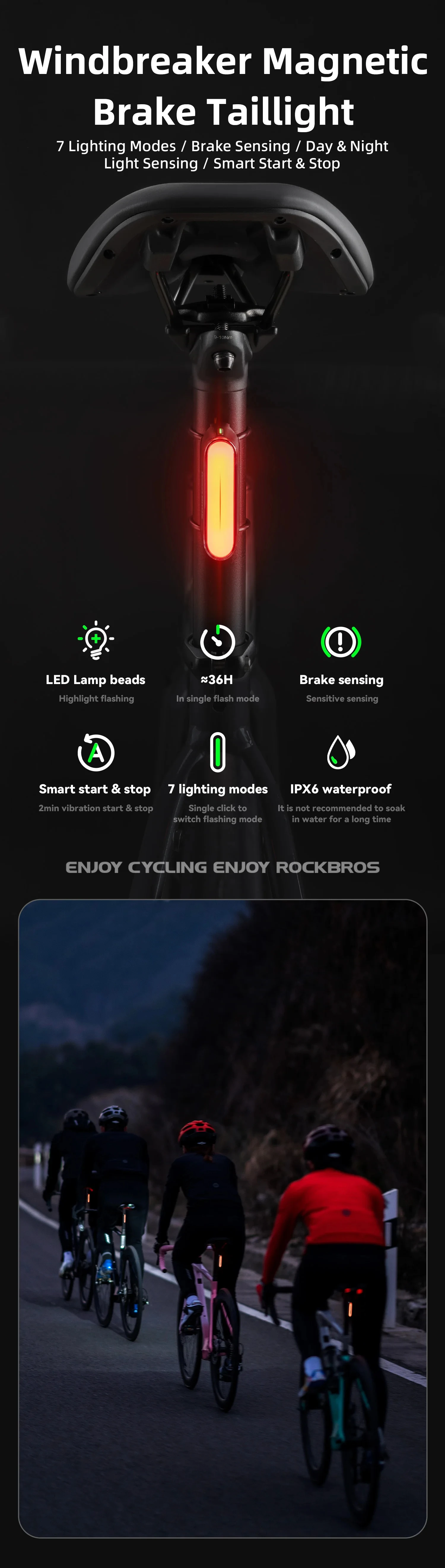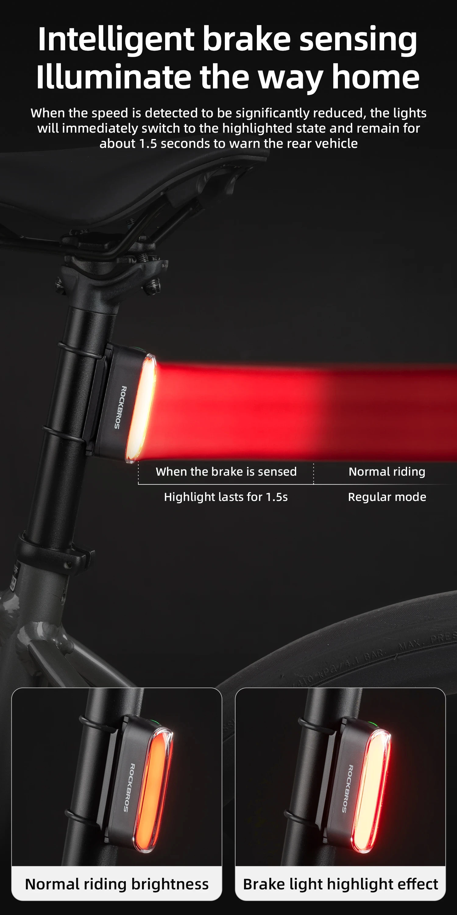 ROCKBROS Bicycle Light Magnetic Smart Tail Light Type-C Charge 7 modes 400mAh LED Lamp Beads Intelligent Brake Sensor Function