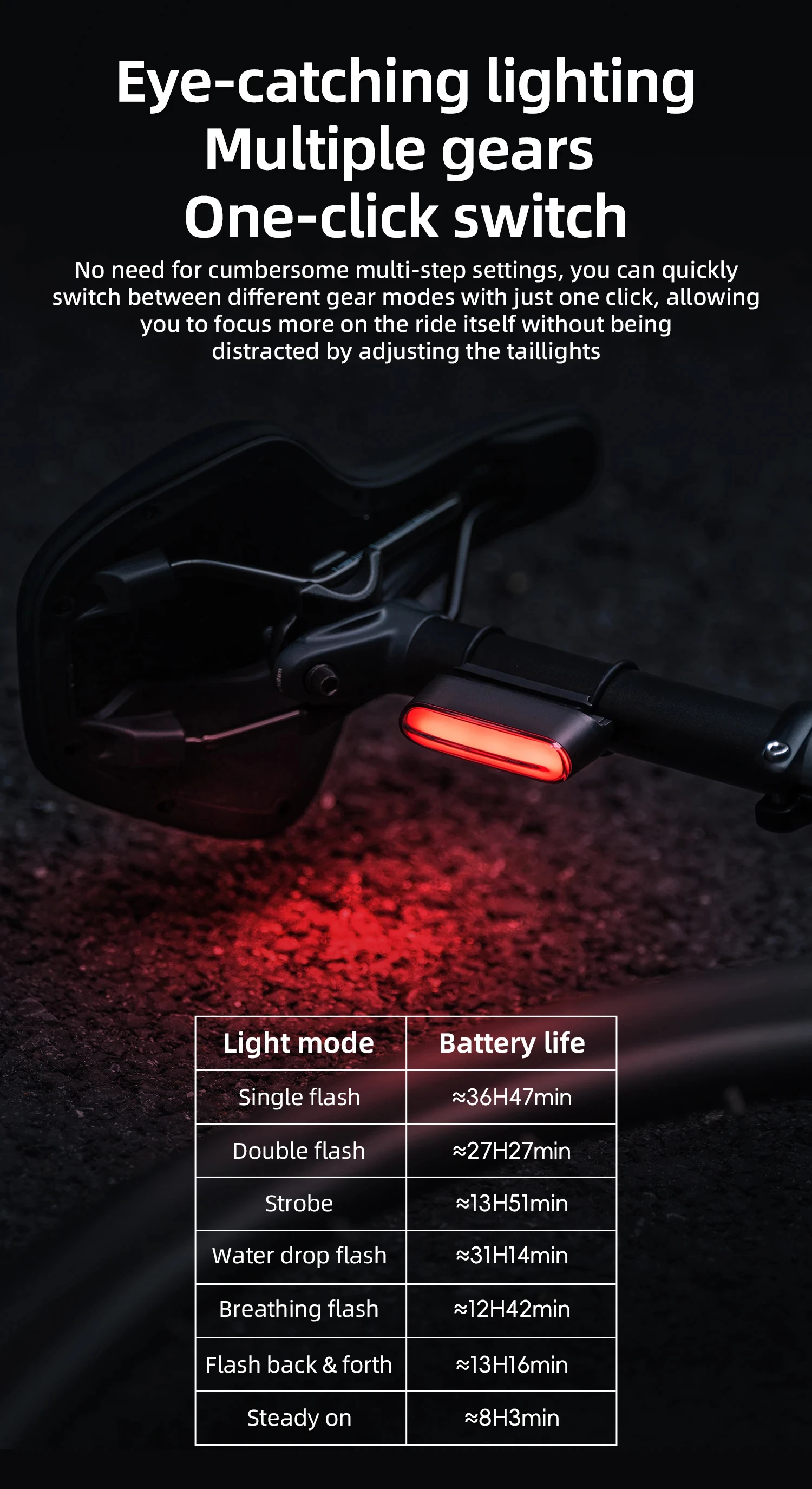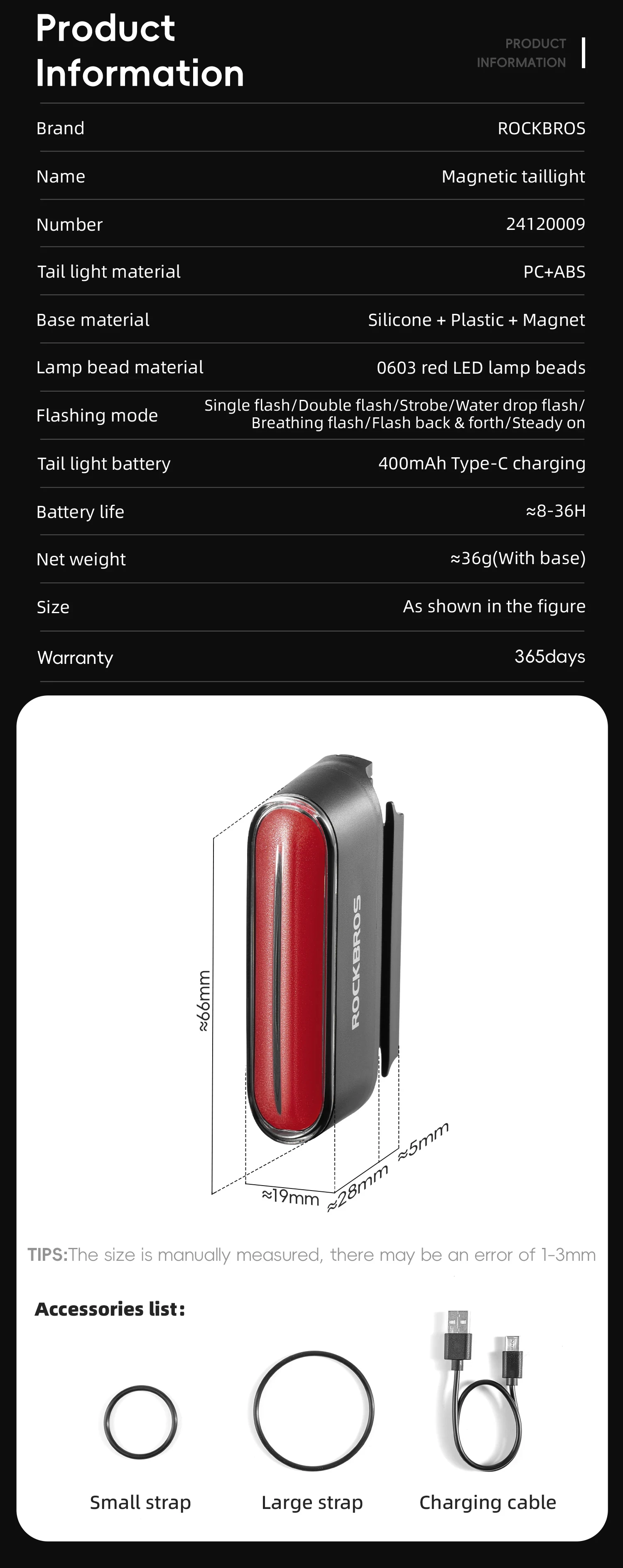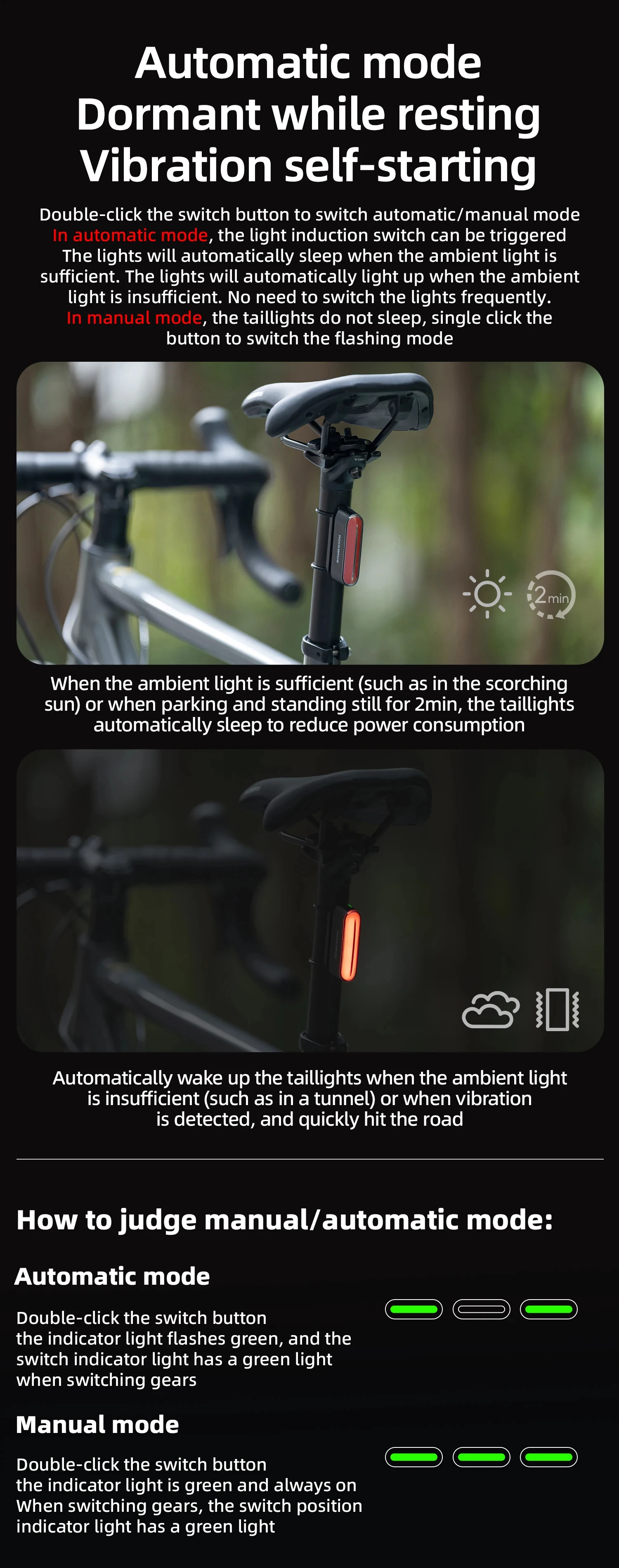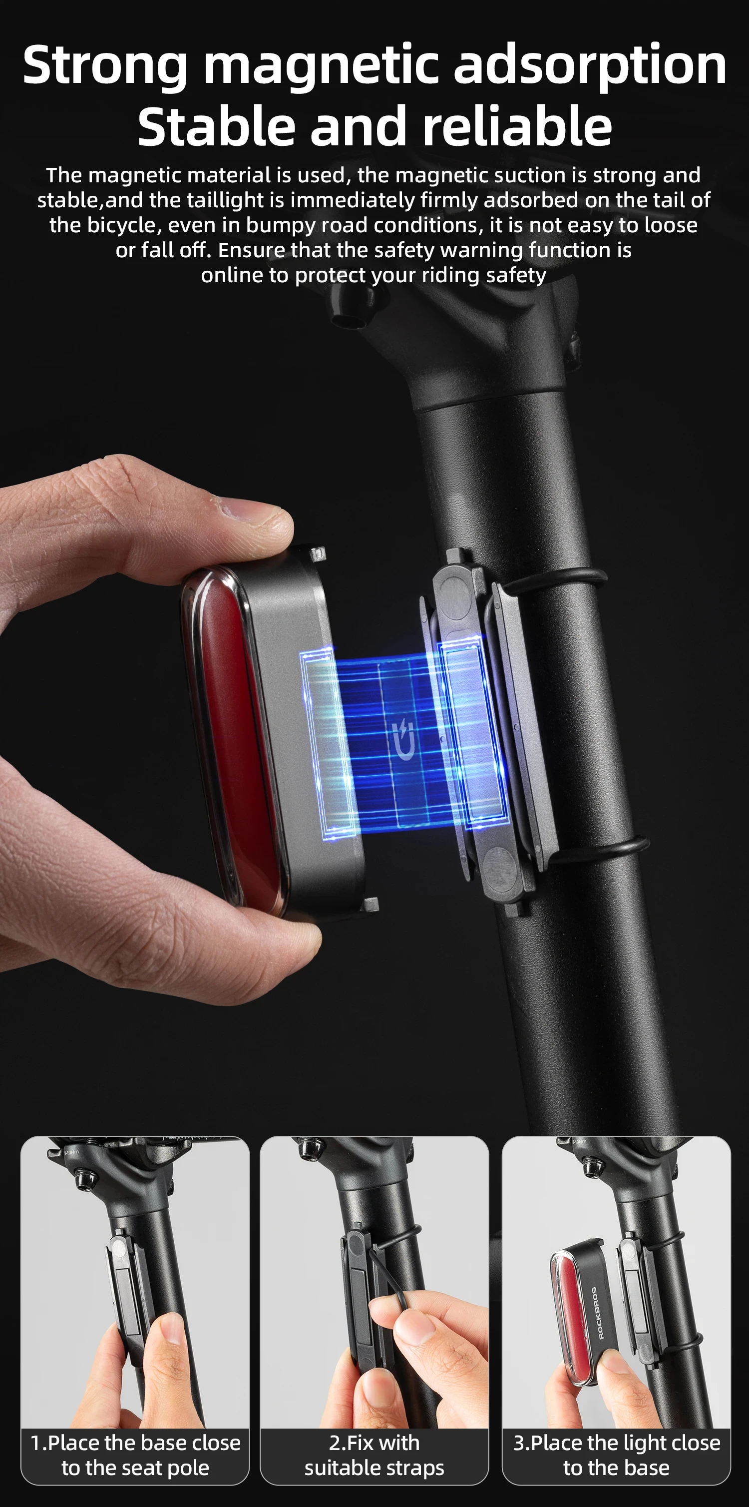 ROCKBROS Bicycle Light Magnetic Smart Tail Light Type-C Charge 7 modes 400mAh LED Lamp Beads Intelligent Brake Sensor Function
