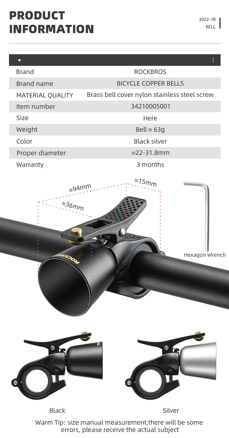 ROCKBROS Local Shipping Bicycle Bell MTB 100db Alloy Bike Ring Copper Horn Warning Safe Crisp Cycling Bells Accessorie