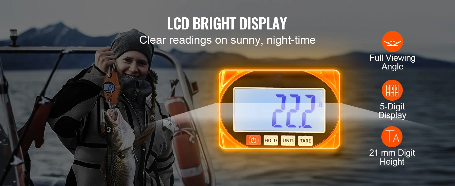 Say Sayonara to pesky narrow-view screens. With a high-brightness LCD on our hook scale, you get clear views from every angle. 5 separate digits, standing tall at 21 mm, ensure clarity anytime, anywhere.