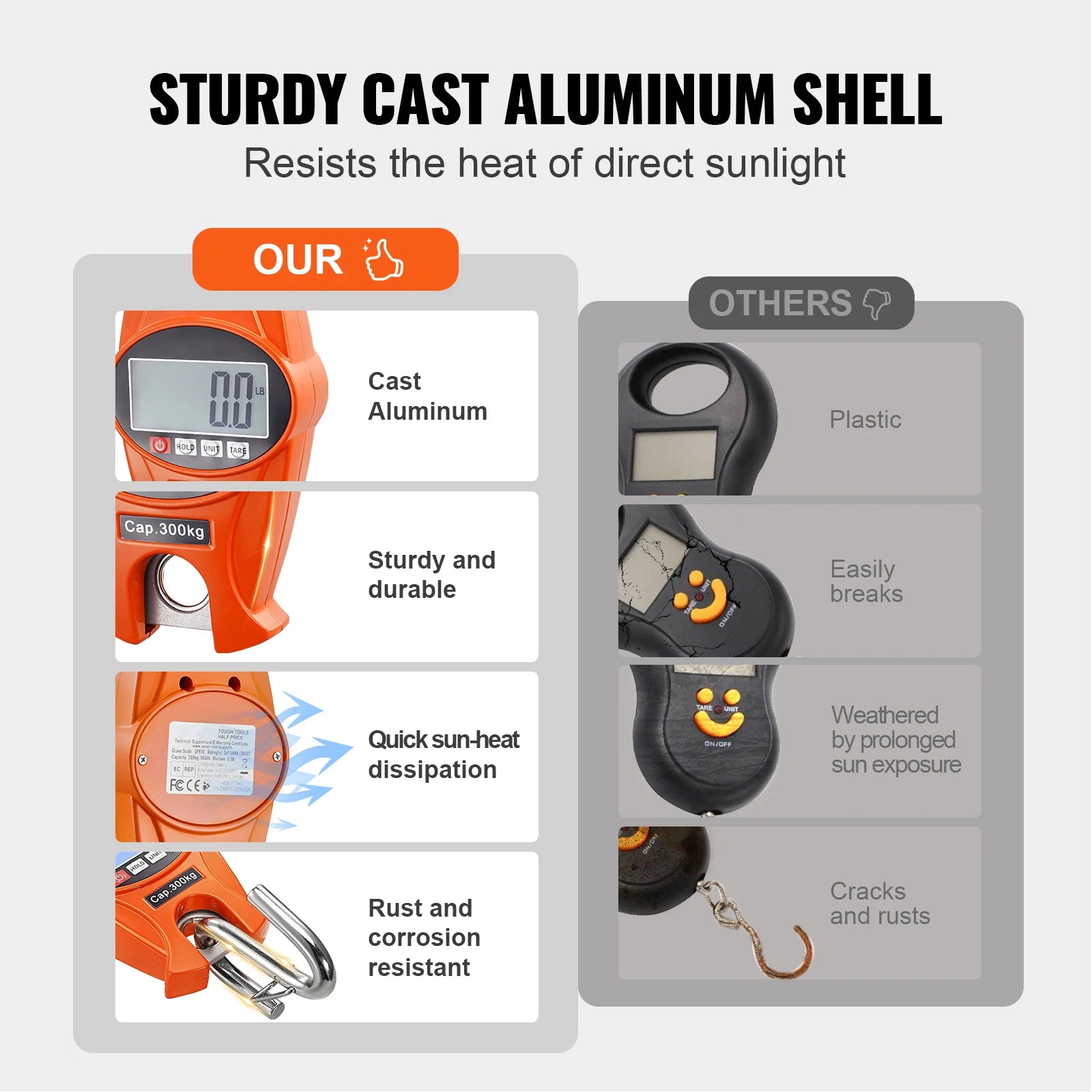 Sturdy Cast Aluminum Material: Forget those fragile plastic scales! Our hanging scale sports a shiny cast aluminum body. It's like the superhero of crane scales: basks in the sun, laughs at rust, and isn't bothered by a bit of heat or cold (yeah, from -10℃ to 40℃). Plus, its sleek design feels oh-so-right in your hand.
