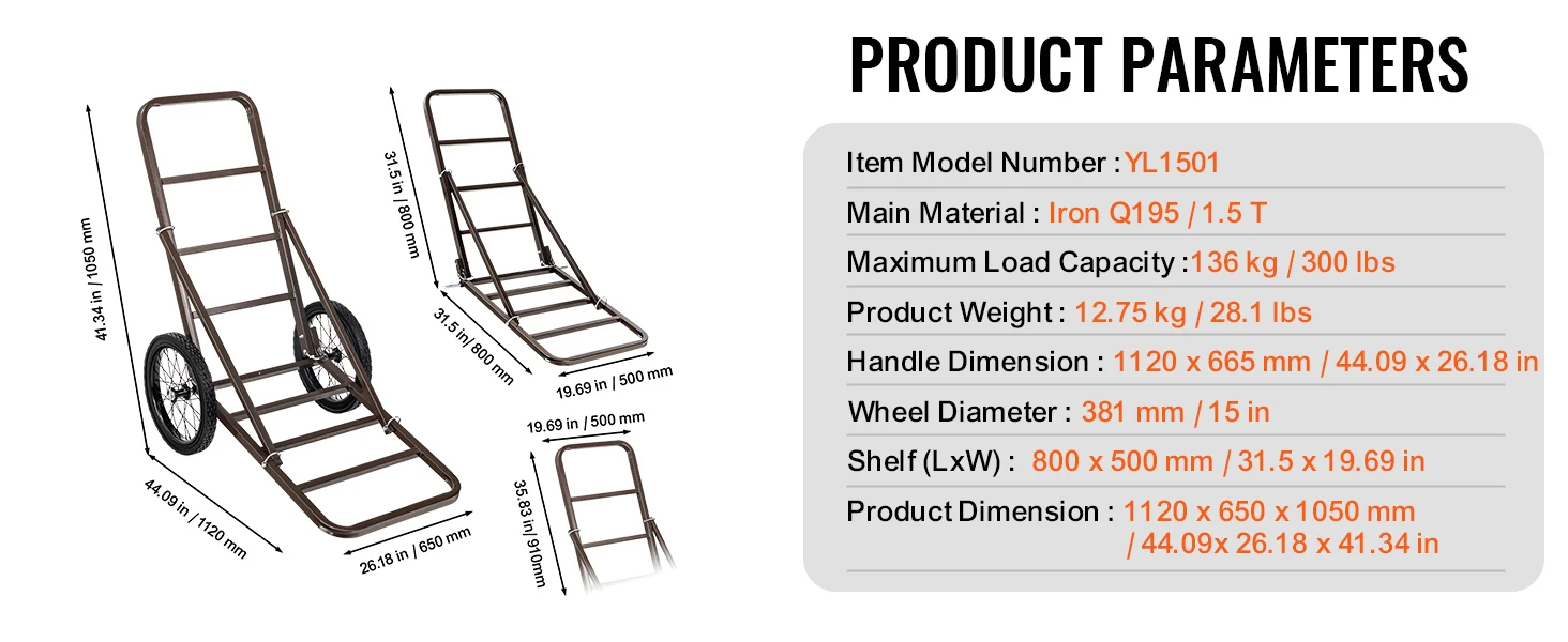 Spacious Cargo Space: The deer cart game hauler provides ample space for game and equipment, meeting the demands of transporting large items. Each component is well-made, with comfortable large handles measuring 36.4x17.5 inch, ergonomically designed to reduce fatigue when pushing the cart, making it easy to drag game out of the forest.