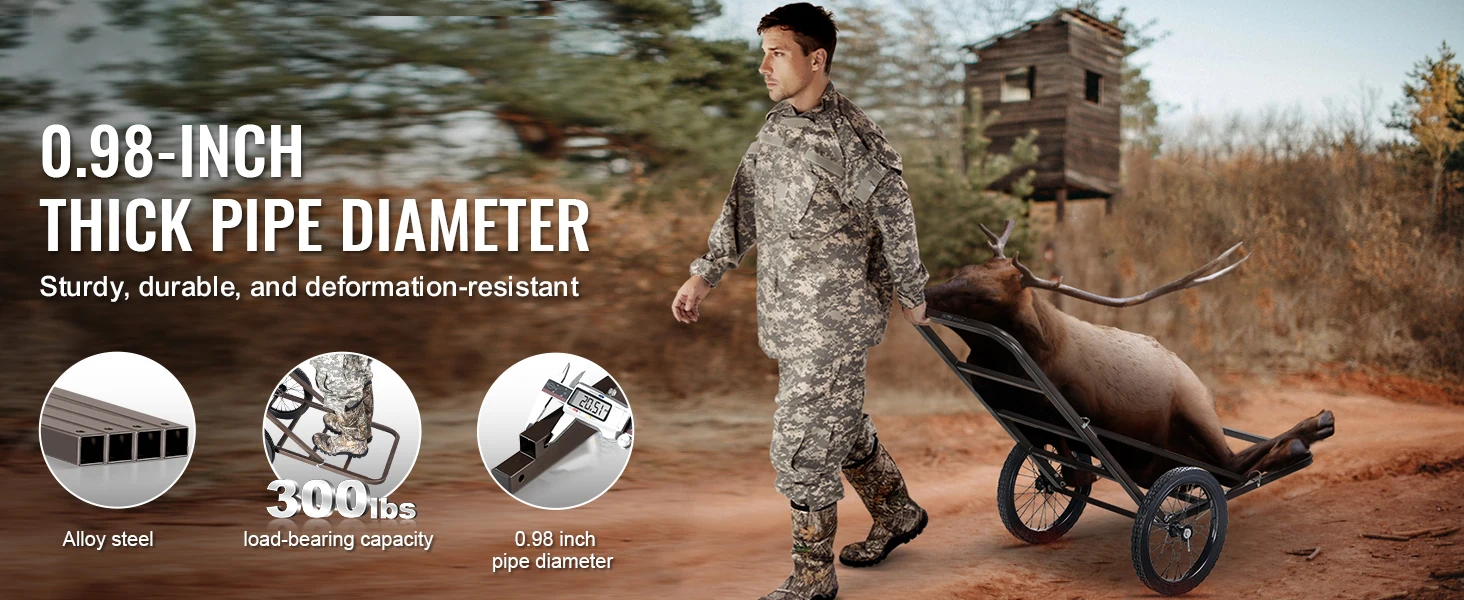 Strong Bearing Capacity: This excellent deer cart features an alloy steel structure with a 0.98-inch thick pipe diameter, providing a carrying capacity of up to 300 pounds, making it perfect for transporting gear and game during hunting. It can traverse rugged terrain and arrive smoothly at its destination, which is crucial for hunters, ensuring stability for long-term use.