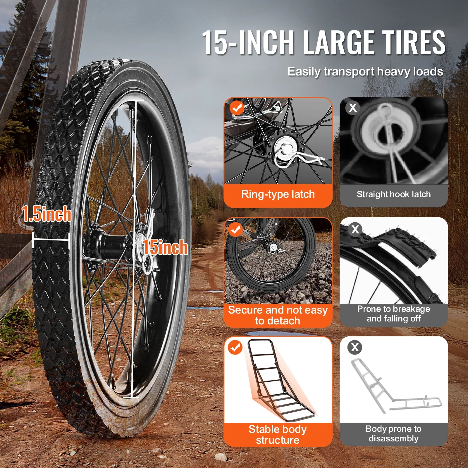Solid Rubber Tires: Unlike inflatable tires, this folding game cart uses 15-inch solid rubber tires, avoiding the risk of punctures and air leaks, and offering resistance to various terrains. With a larger tire diameter, transportation becomes easier and more flexible. Additionally, the tire's hitch pin features a ring-lock design, providing better security compared to conventional straight hook connections, ensuring the stability of the cart and preventing disassembly.