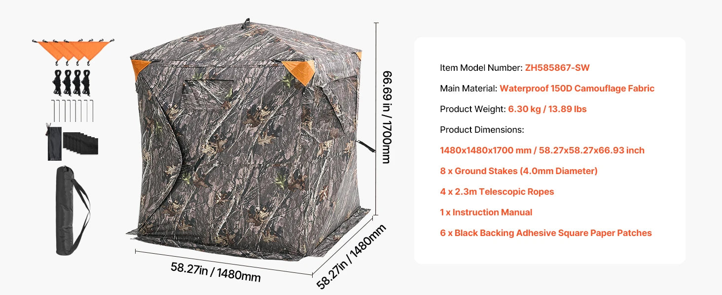 Stealth and Quiet: The ground blind is made of camouflage fabric with brush-in loops on the top and around the middle, making it easier to blend into the hunting environment. It also features silent sliding windows and a ground skirt to minimize detection and reduce disturbance to game.
