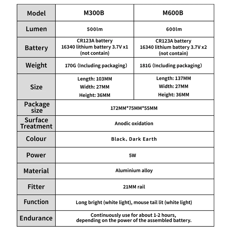 Lumens: M300B/500lm,M600B /600lm